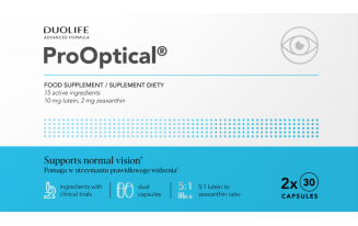 ProOptical® Advanced Formula to zaawansowany suplement diety stworzony z myślą o wsparciu zdrowia oczu. Preparat łączy w sobie dwa rodzaje kapsułek: miękką typu „softgel” oraz twardą, dostarczając kluczowych składników odżywczych niezbędnych dla prawidłowego funkcjonowania narządu wzroku.